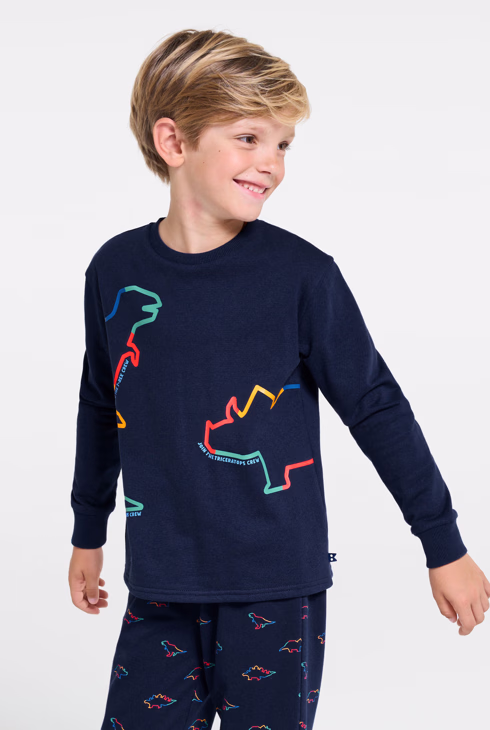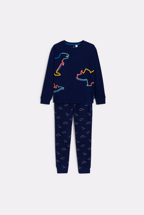 2-teiliger Pyjama aus marineblauem Samt mit Dinosaurier-Motiv für Jungen