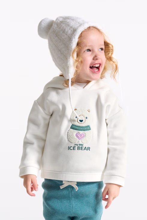 Baby-Sweatshirt mit Kapuze, Sherpa-Futter und gesticktem Bären für Mädchen