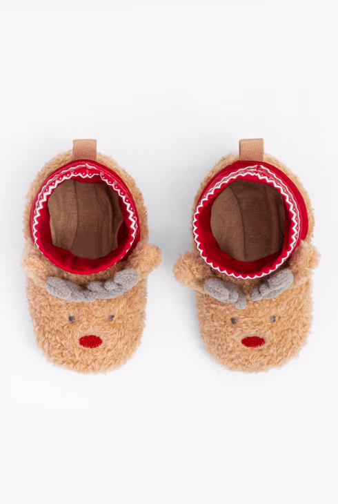 Beigefarbene Socken-Hausschuhe mit Weihnachtsmotiv zur Geburt