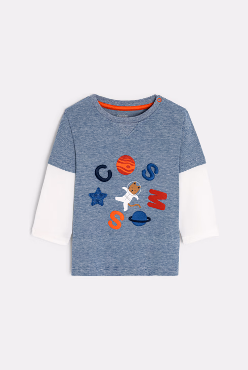 Blaues gestreiftes Baby-T-Shirt mit 2-in-1-Effekt, Astronautenkatzenmotiv, Jungen
