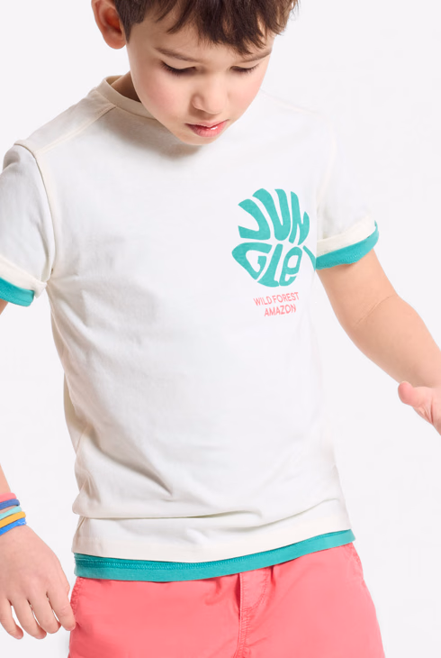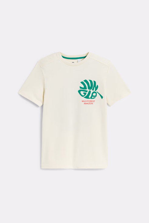 Eierschalenfarbenes T-Shirt mit Schriftzug und Blattmuster vorne und hinten für Jungen