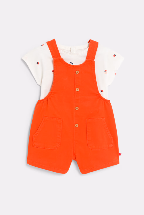 Latzhose aus Twill und T-Shirt mit Erdbeermotiv in Rot Baby Mädchen