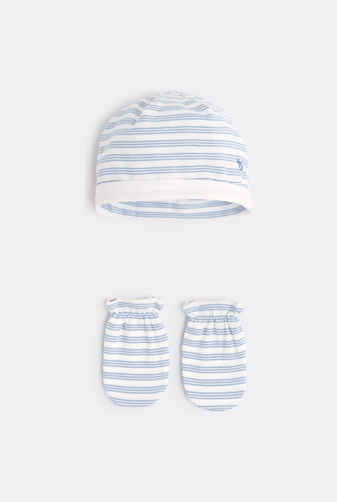 Mütze und Fäustlinge aus gestreiftem Jersey Blau Geburt