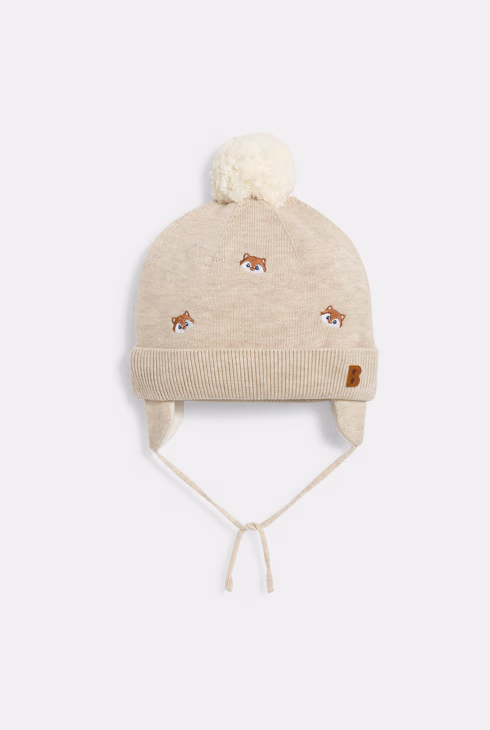 Peruanische Baby-Mütze aus beigem Strick mit Fleecefutter und Fuchsmotiv für Jungen