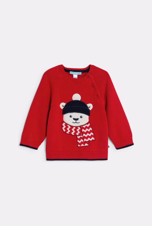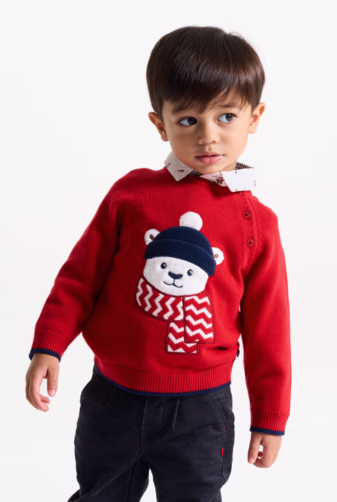 Roter Baby-Pullover aus Strickgewebe mit Bärenmotiv für Jungen