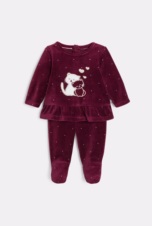 Samtpyjama in Bordeaux mit Katzenmotiv für kleine Mädchen