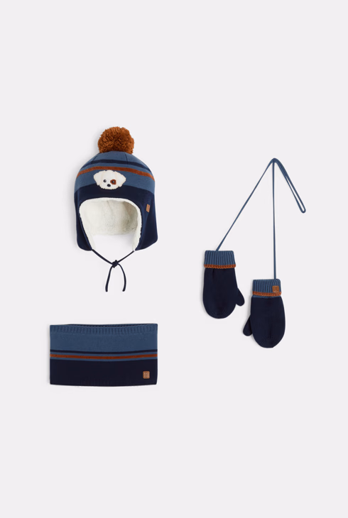 Set in Blau bestehend aus Strickmütze, Snood und Fäustlingen mit Hundemotiv für kleine Jungen