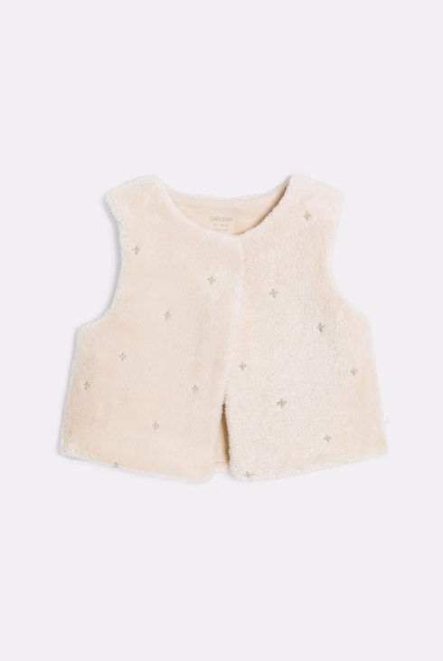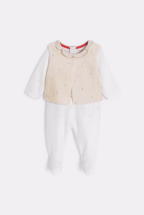 Weißer Strampler aus Samt und beige Weste für kleine Mädchen